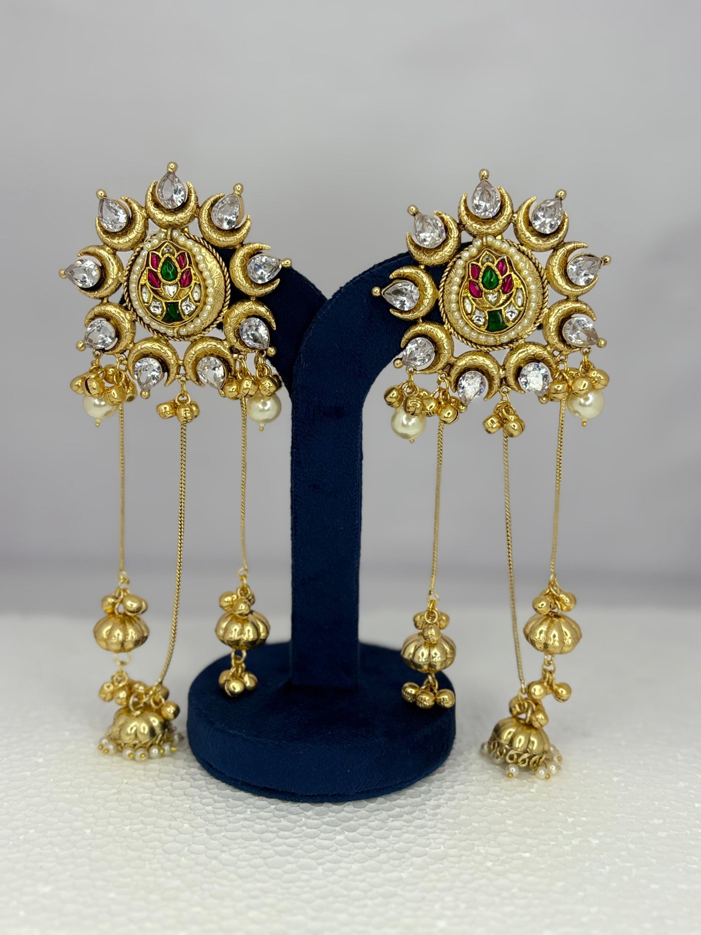 Add celestial charm to your look with Chandrika, a pair of exquisite chandbali-style earrings inspired by moonlit elegance, featuring sparkling stones, delicate pearls, and traditional hanging ghungroos for a graceful ethnic statement.