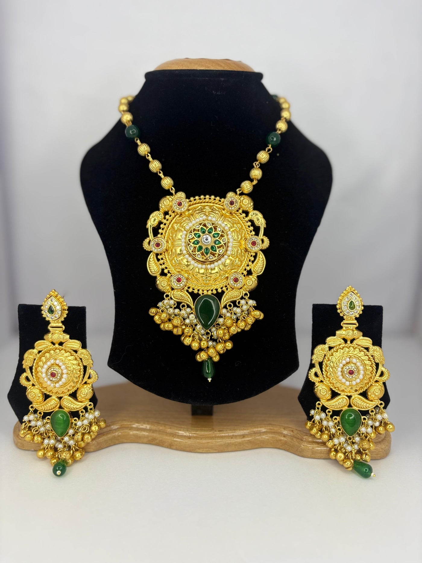 Drape yourself in majestic splendor with Kamolika, an opulent necklace set showcasing an elaborate circular pendant, emerald green drops, and exquisite stonework — perfect for grand occasions where every detail speaks royalty.