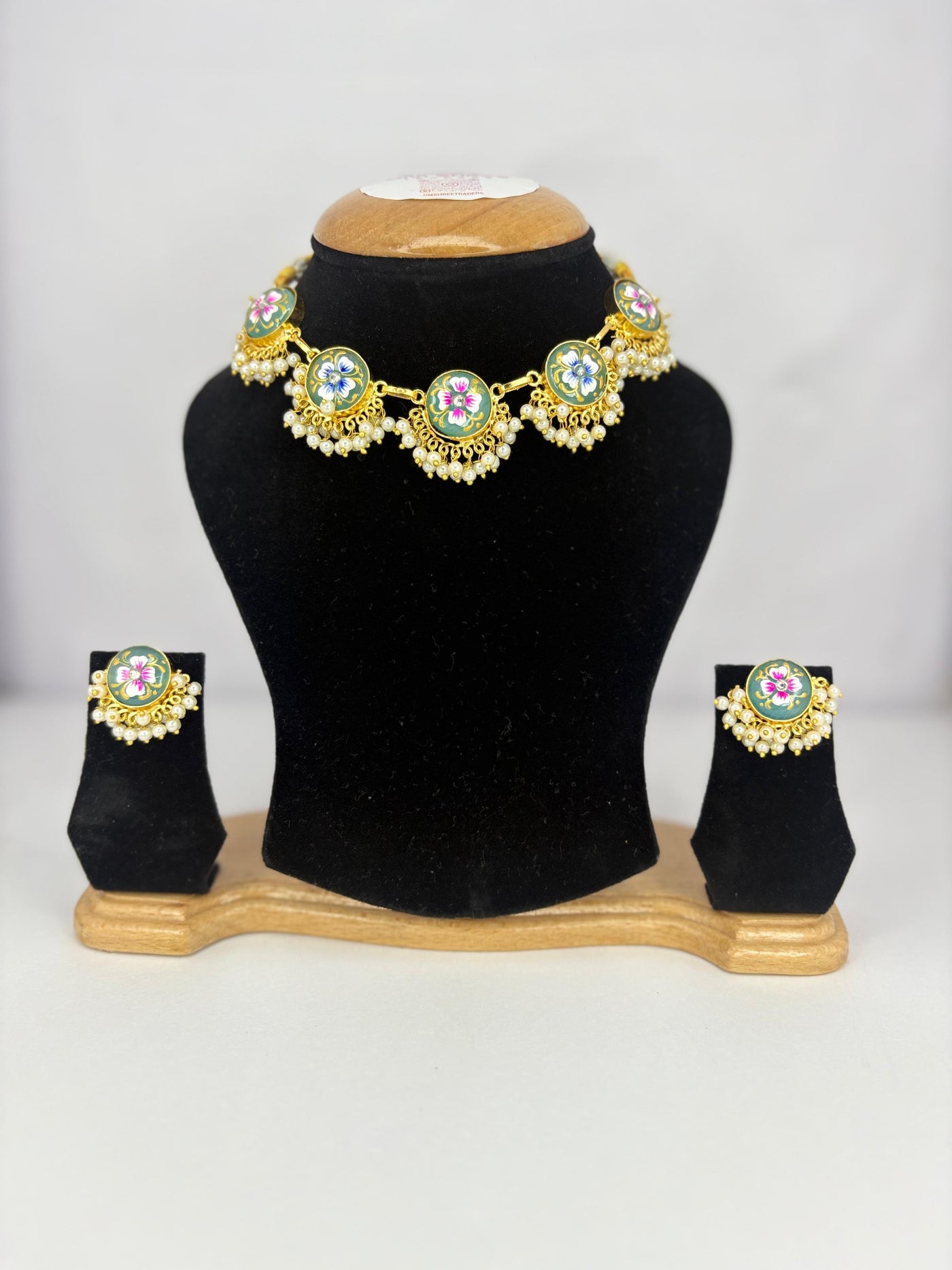 Celebrate grace and colors with Vrinda, a charming floral necklace set embellished with radiant multicolor stones and pearl detailing — a perfect blend of elegance and vibrance for your festive and wedding looks.